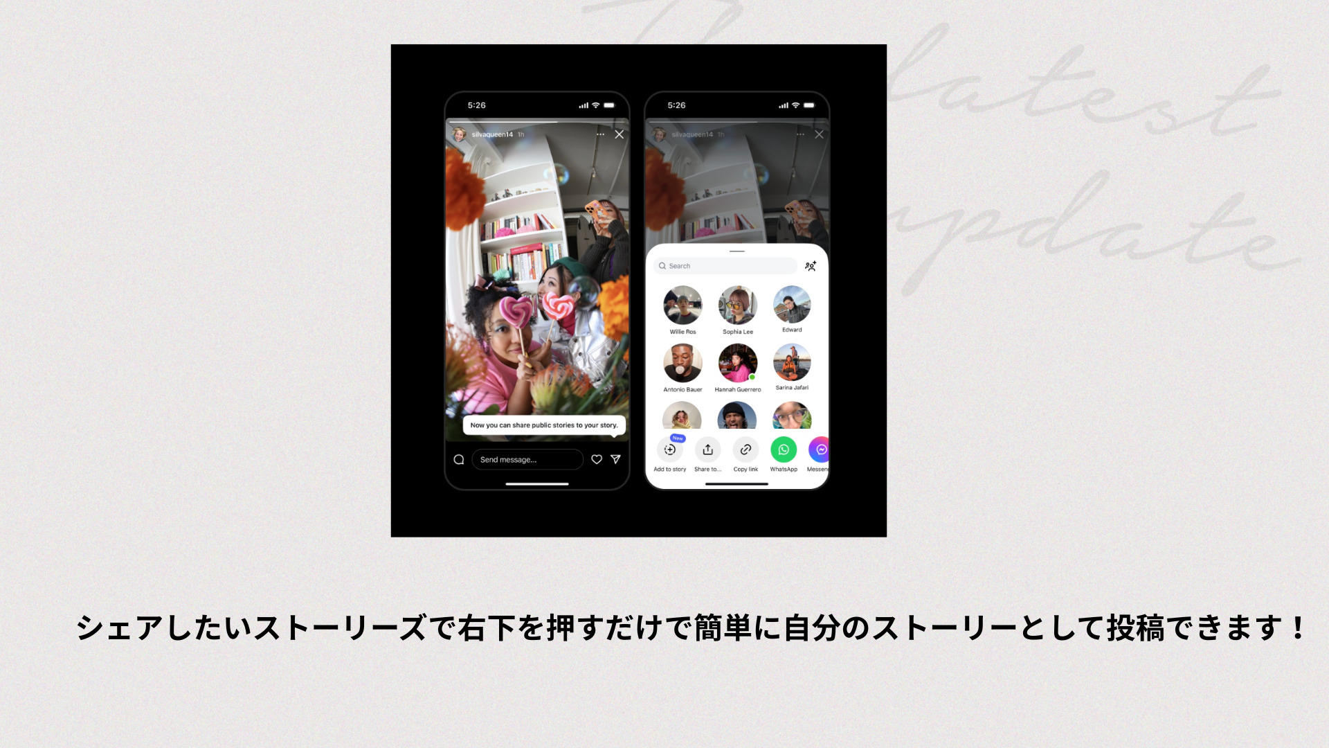 シェアしたいストーリーズの右下をタップして自分のストーリーとして投稿するだけ!✨